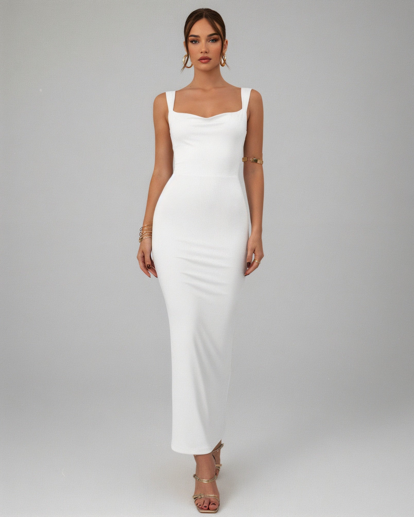 Turn heads in the Evelle gown, a sleek, figure-hugging maxi with a cowl neckline and wide straps that frame the décolletage. The dramatic open back steals the spotlight, tied together with an elegant satin bow that adds a touch of romance. Crafted with a soft, stretch finish, this dress moves effortlessly with the body.